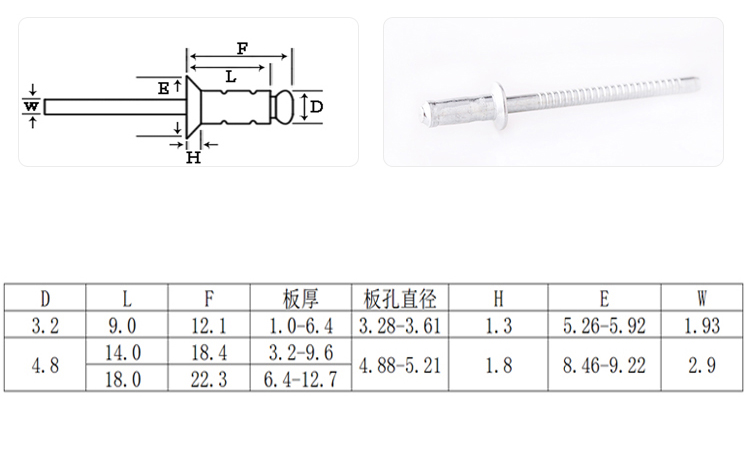 单鼓沉头铁抽芯铆钉,它分为铆体(钉壳)和钉芯(钉杆)两部分。铆体式产生塑性变形、夹紧两个板件、实现铆接紧固的部分;钉芯抽拉式促使铆体发生可塑性变形的部分。